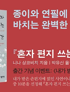 내가 받은 최고의 손편지 한통! _<혼자 편지 쓰는 시간> 출간 이벤트 출간 기념 이벤트!! 내가 받은 최고의 손편지 한통 자신이 받은 가장 기억에 남는 손편지 한통을 소개해주세요. 손편지의 사연도 좋고, 사진이나 한 구절도 좋습니다. 아래 댓글로 올려주시면 10분을 선정하여 신간 과 한지수첩을 드립니다. 의 니나 상코비치가 전하는 두번째 감동. 고대 이집트의 편지에서 조선 시대 정약용의 편지까지 동서고금의 편지 100여 통에 담긴 손편지의 숨결. 참여 방법: 북인더갭 홈페이지(아래 댓글 참조) 또는 페이스북(https://www.facebook.com/bookinthegap)에 댓글 달기. 발표: 2015년 11월 2일 2015. 10. 23. 이전 1 다음