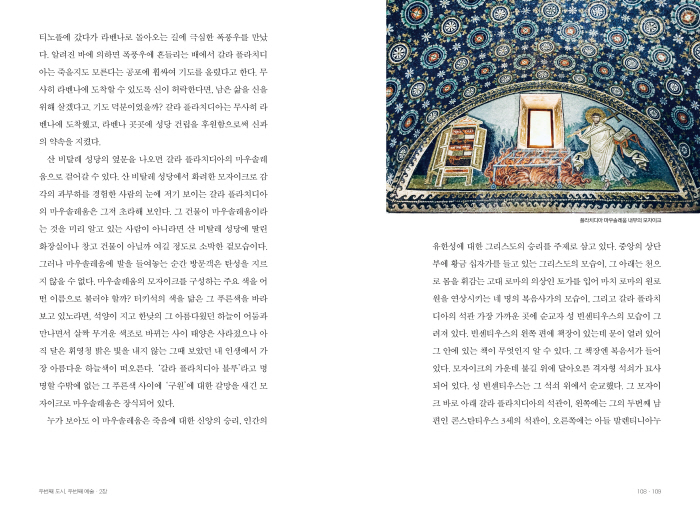 터키석의 색을 닮은 그 푸른색을 바라보고 있노라면, 석양이 지고 한낮의 그 아름다웠던 하늘이 어둠과 만나면서 살짝 무거운 색조로 바뀌는 사이 태양은 사라졌으나 아직 달은 휘영청 밝은 빛을 내지 않는 그때 보았던 내 인생에서 가장 아름다운 하늘색이 떠오른다. ‘갈라 플라치디아 블루’라고 명명할 수밖에 없는 그 푸른색 사이에 ‘구원’에 대한 갈망을 새긴 모자이크로 마우솔레움은 장식되어 있다. 108면